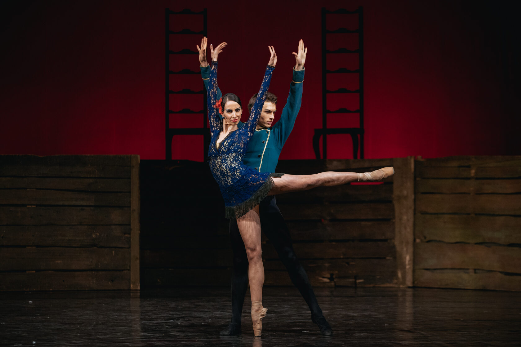 Alonso’s scenario centers on Carmen, Don José and the bullfighter Escamillo. Carmen is a passionate, free-spirited woman in contrast to the temperamental and fickle Don José. Fate, a ballerina dressed in black and a representation of Carmen’s alter ego, tells Carmen’s fortune with a deck of cards. A fight with tobacco dealers leads to Carmen’s arrest by Captain Zúñiga. In jail, she seduces Don José and convinces him to release her. Carmen is subsequently caught in a love triangle between Don José and popular bullfighter Escamillo.